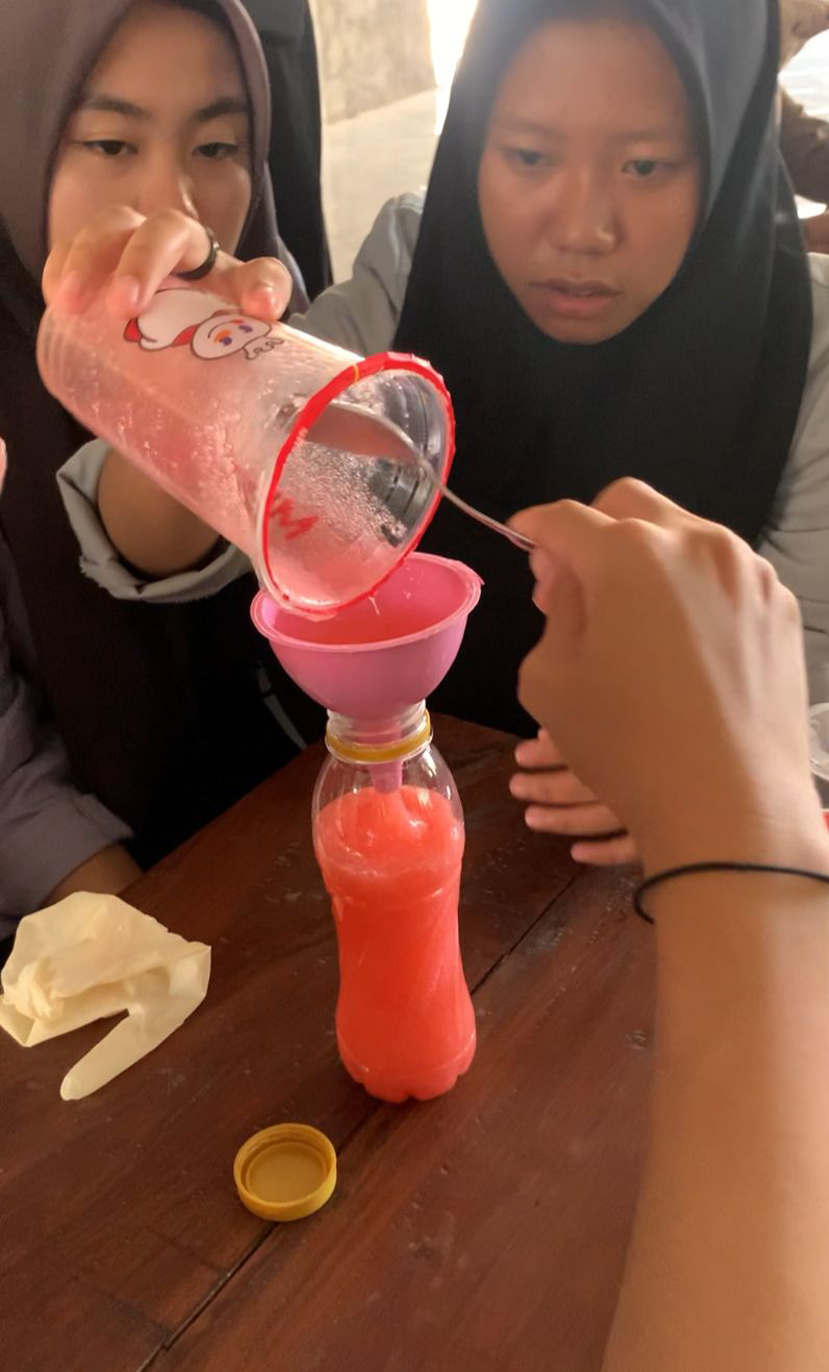 “Kami menggunakan dua metode dalam pembuatan sabun cair, yaitu dengan bahan kimia seperti minyak dan KOH, serta menggunakan texapon. Para santriwati tidak hanya mendengarkan penjelasan, tetapi juga langsung terlibat dalam proses pembuatannya,” jelas Erda.
