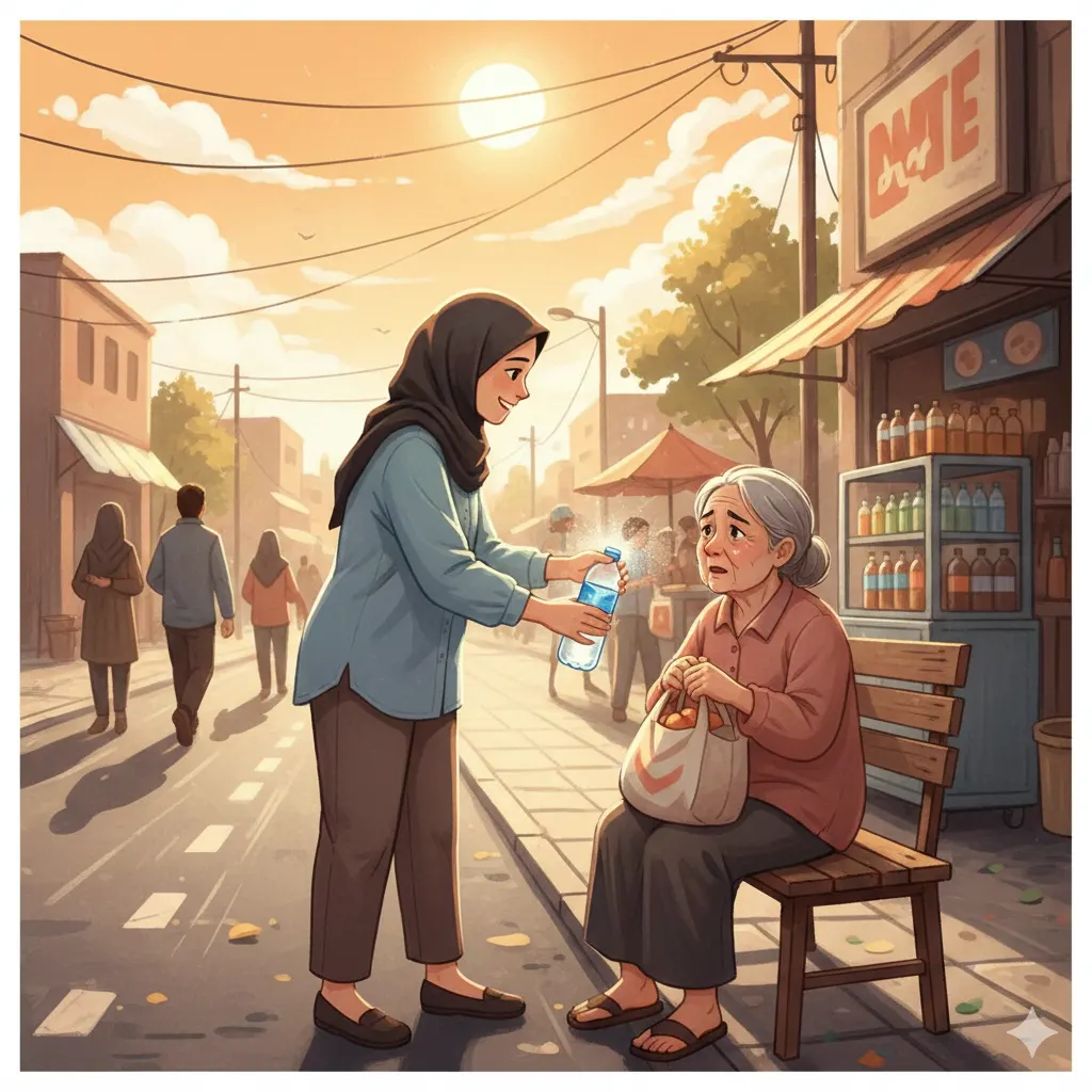 Tanpa berpikir panjang, Fatimah membeli satu botol air mineral dari warung kecil. Ia mendekat, tersenyum, dan menyodorkannya.