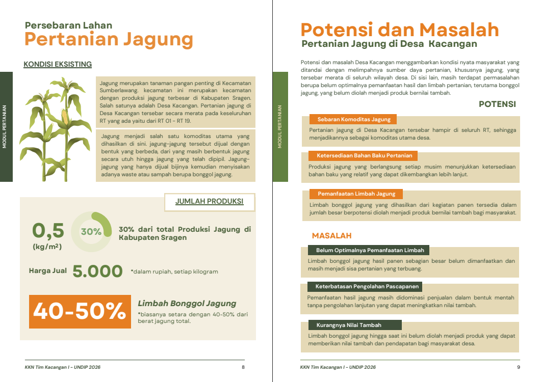 Modul tersebut disusun sebagai upaya mendokumentasikan kondisi pertanian jagung di Desa Kacangan secara sistematis dan mudah dipahami. Selain memuat deskripsi umum pertanian jagung, modul ini dilengkapi peta persebaran lahan pertanian jagung yang menggambarkan lokasi serta sebaran lahan yang selama ini dikelola oleh masyarakat desa.