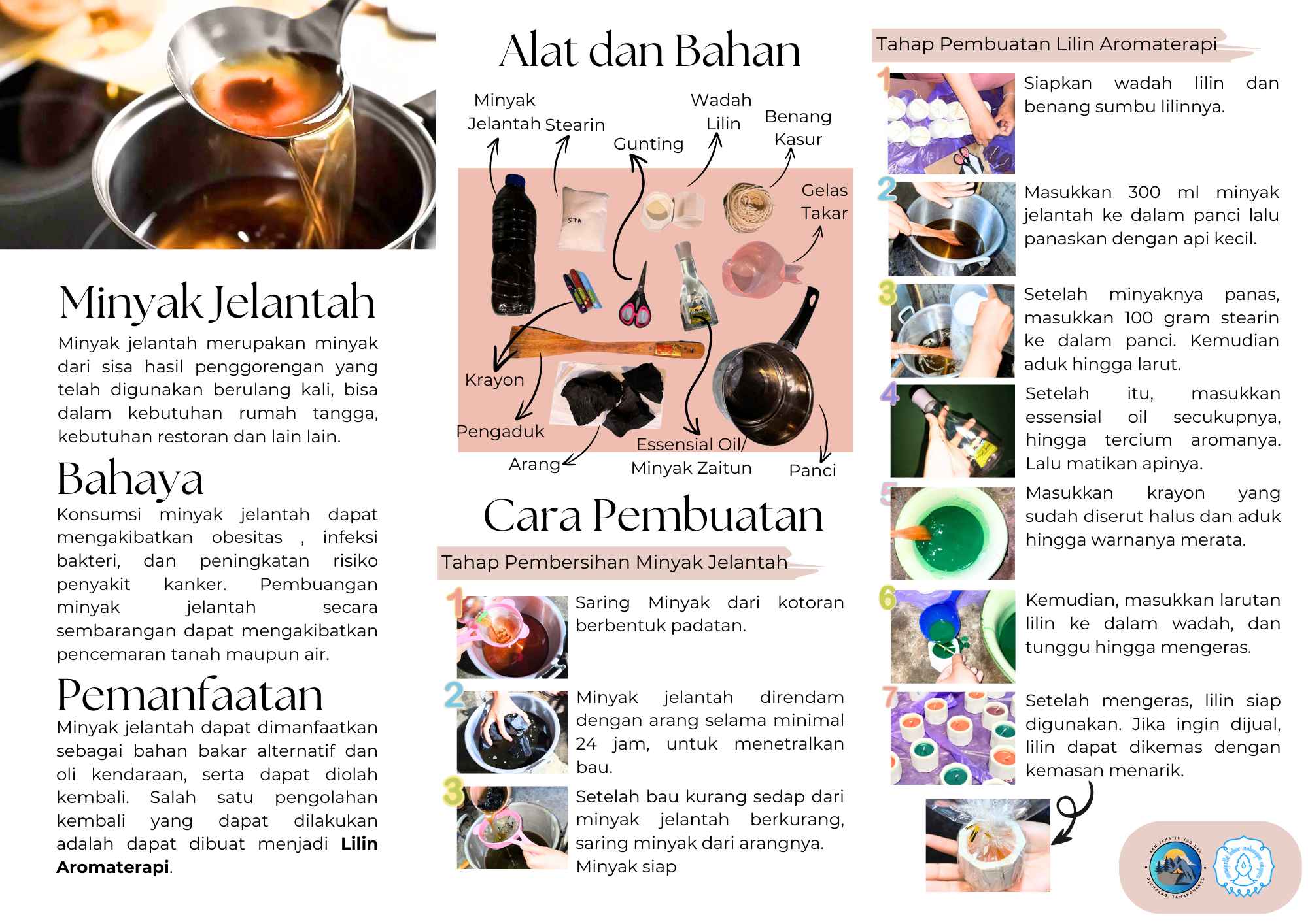 Proses pembuatan lilin ini melibatkan dua tahap utama: pembersihan minyak jelantah dan pembuatan lilin. Pada tahap pertama, minyak jelantah disaring untuk memisahkan kotoran padat, kemudian direndam dengan arang selama minimal 24 jam untuk menetralkan bau. Setelah proses penyaringan ulang, minyak siap digunakan untuk pembuatan lilin.