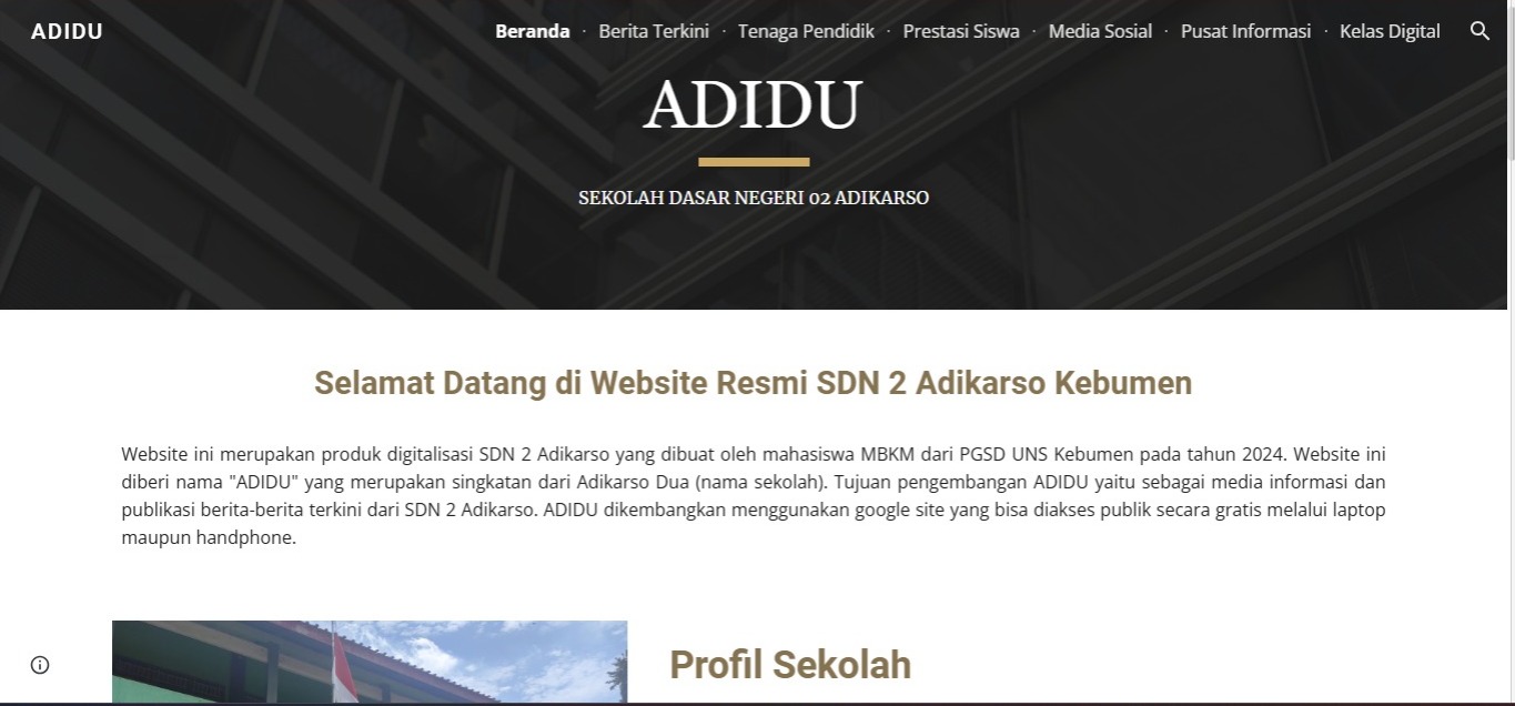 Website sekolah yang diberi nama “ADIDU” (Adikarso Dua) ini dirancang sebagai pusat informasi terpadu yang mencakup profil sekolah, berita terkini, informasi akademik, hingga layanan kelas digital.